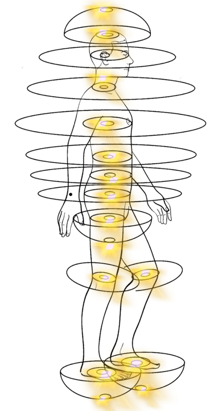 Folgen sie dabei den Chakren und schliessen sie auch Knie und Füsse mit ein, wie auf dem Bild gezeigt. Vergessen sie auch den «animalischen» Punkt nicht auf der Rückseite des Kopfes, gegenüber dem dritten Auge.